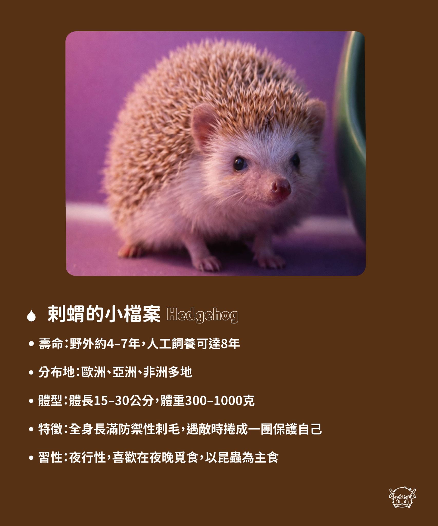 圓滾滾的身體加上一身尖剌,剌蝟就是動物界的「安靜防禦者」。平時喜歡獨處、愛鑽洞,遇到驚嚇時就縮成一顆小針球,既可愛又防禦力十足 !