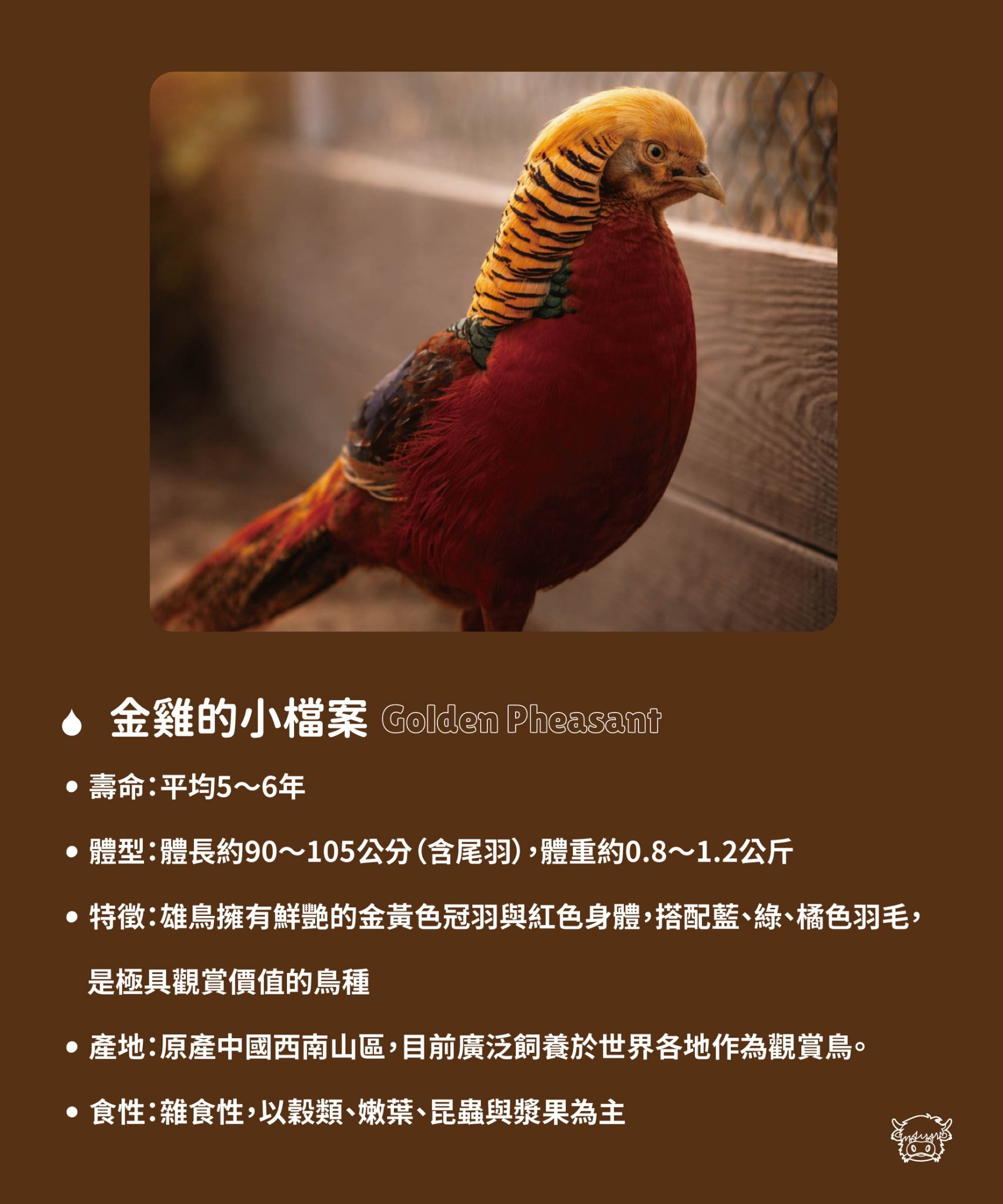 擁有金黃色羽冠與如火焰般的身體羽色,金雞被譽為「森林中最華麗的舞者」,每一個轉身都像一場自然界的時尚秀 ! 牠們不僅外型耀眼,溫馴警覺的個性,也讓金雞成為園區裡的觀賞焦點。