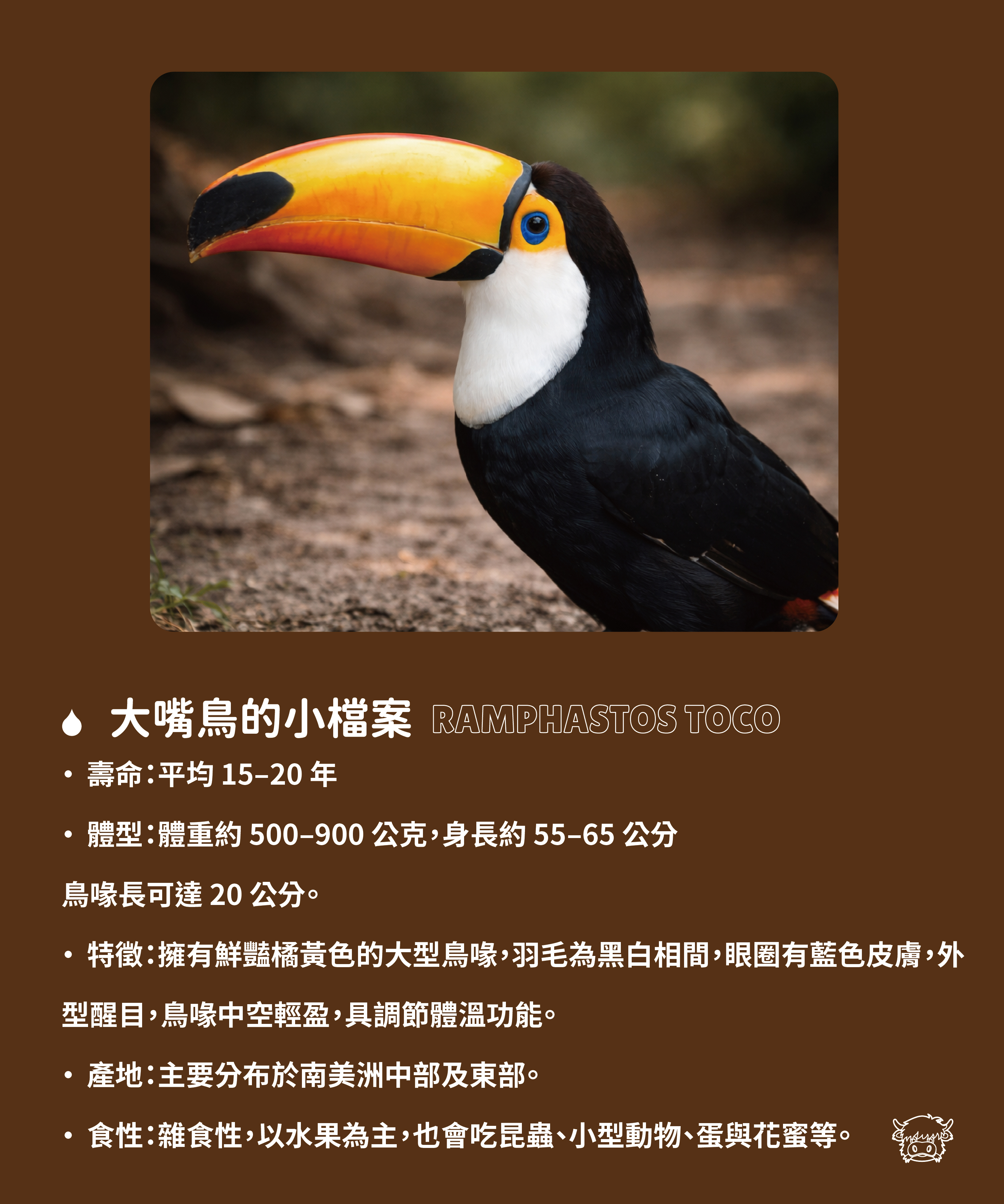 歡迎來到色彩繽紛的大嘴鳥世界,一口就能成為焦點! 黑白分明的羽毛配上一張巨大的橘黃色鳥喙,是不是覺得像卡通裡走出來的明星? 大巨嘴鳥,來自熱情的南美洲雨林,是鵎鵼科中體型最大的成員。別看我嘴巴這麼大,其實超輕盈 ! 除了吸晴,還能用它抓水果、整理羽毛、甚至調節體溫呢 !。
