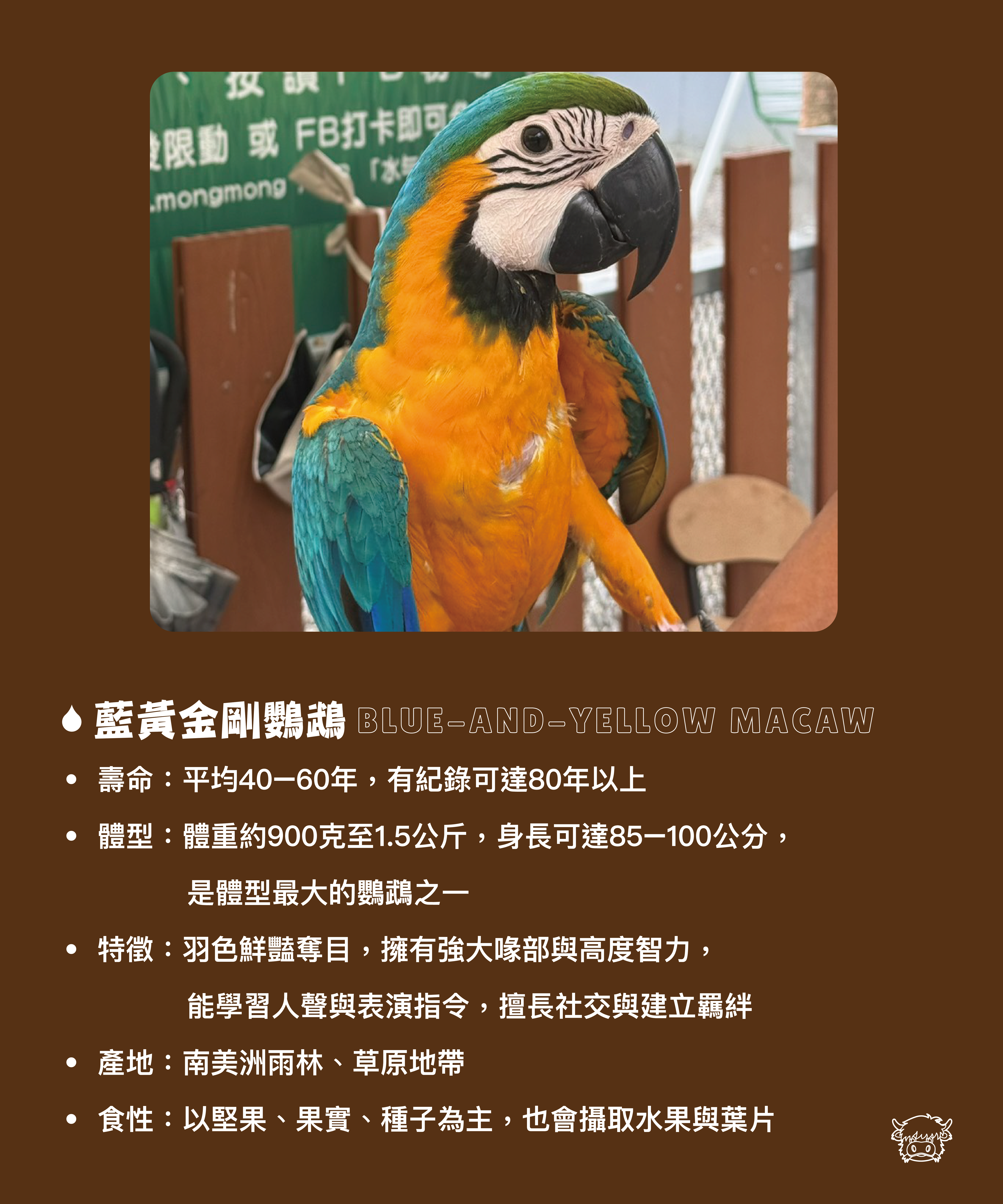 藍黃金剛鸚鵡(又名:琉璃金剛鸚鵡),一身耀眼羽毛像是熱帶陽光下的畫布,藍得鮮明、黃得溫暖,走到哪裡都是全場目光的焦點。除了出眾外型,牠們更擁有驚人的智商與模仿力,是鳥界公認的「說話高手」與「情感型社交王」 ! 牠們活潑、好奇又黏人,是園區中最有戲份的羽毛明星。