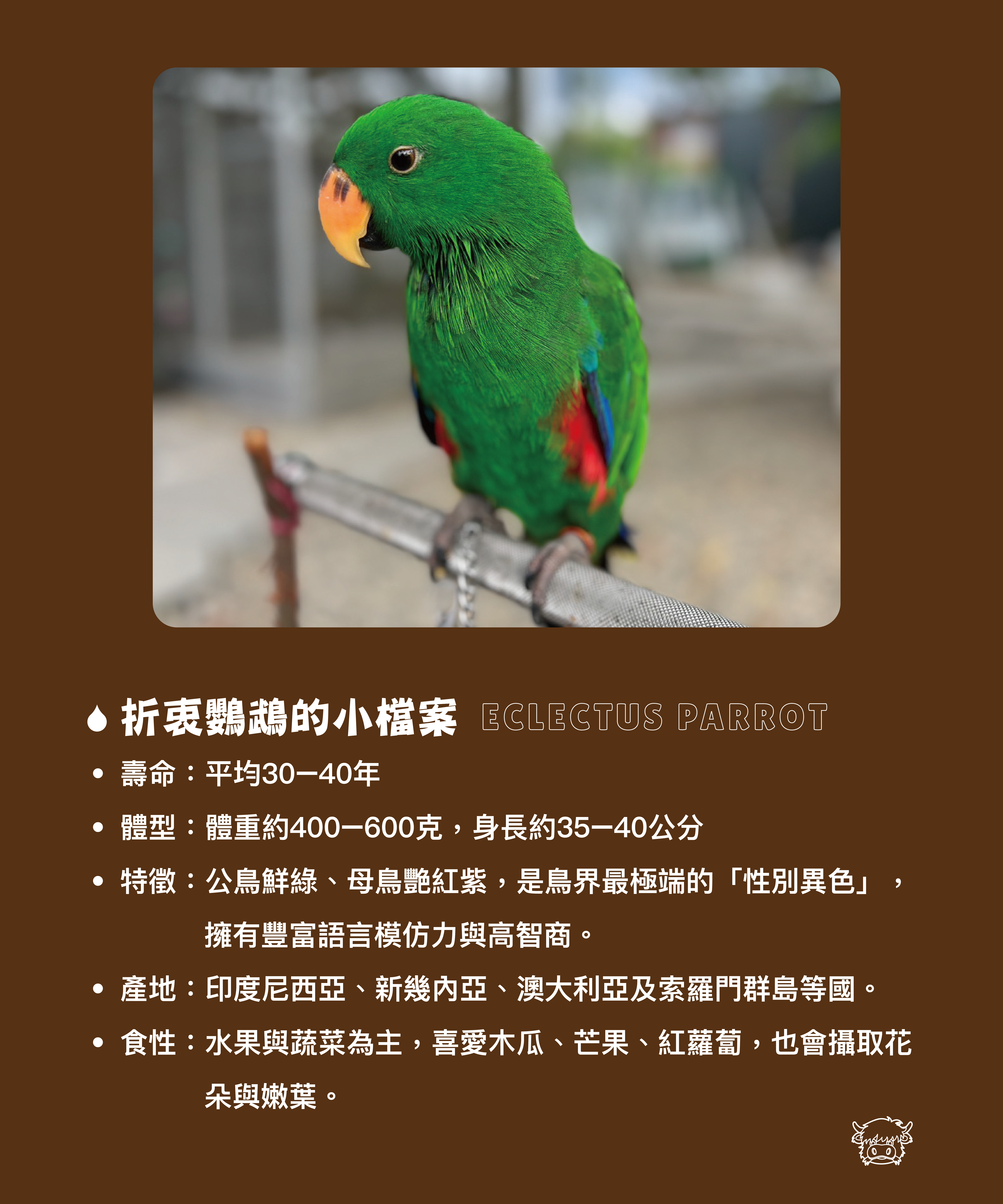 折衷鸚鵡,擁有「公綠母紅」絕美對比的語言天才,是鳥界最繽紛又聰明的使者。牠們天生絕配,用羽毛說話、用聰明連結著我們。