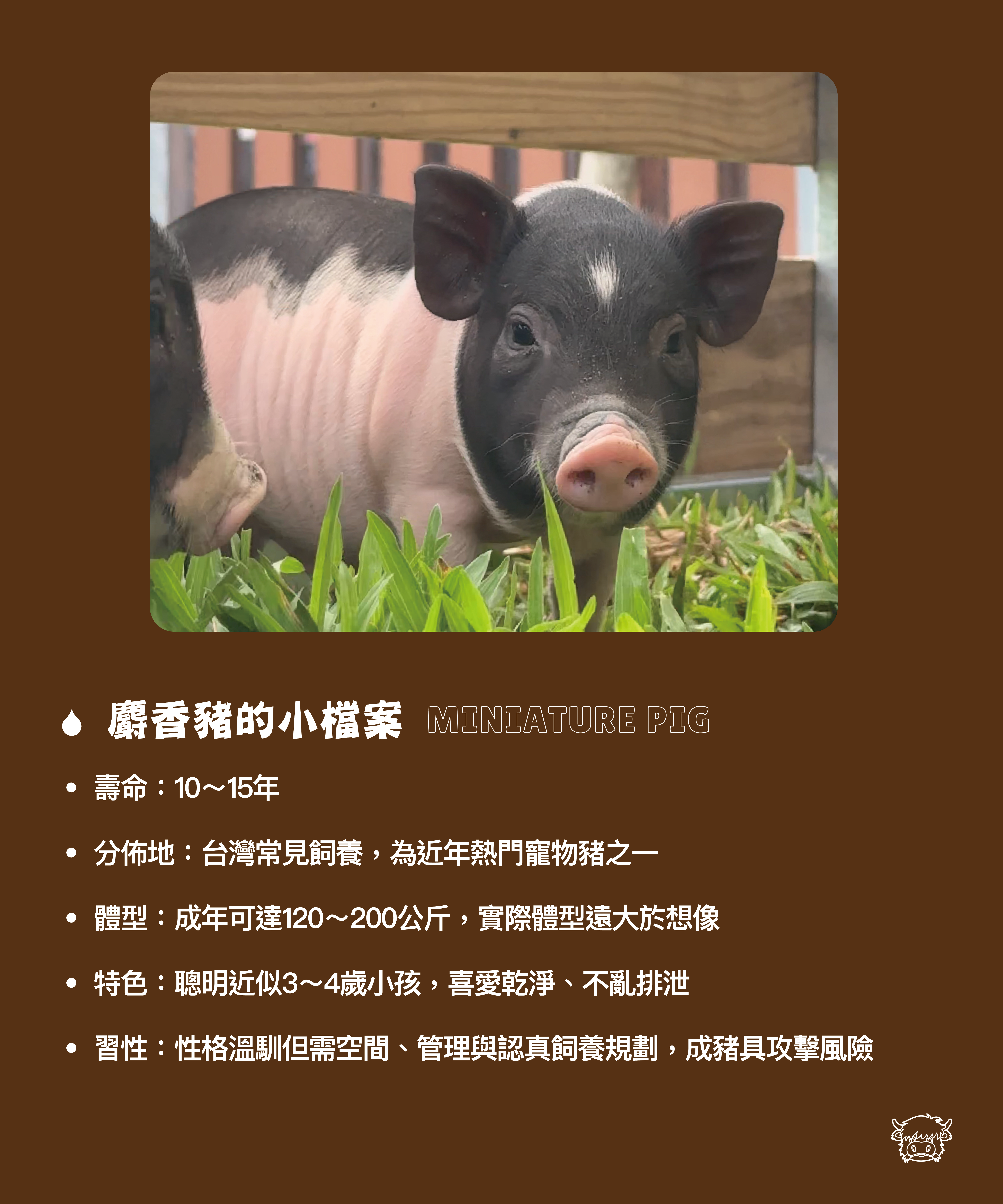 • 性格溫馴親人:可愛的麝香豬性格溫馴親人、黏人愛撒嬌,是許多飼主的開心果!