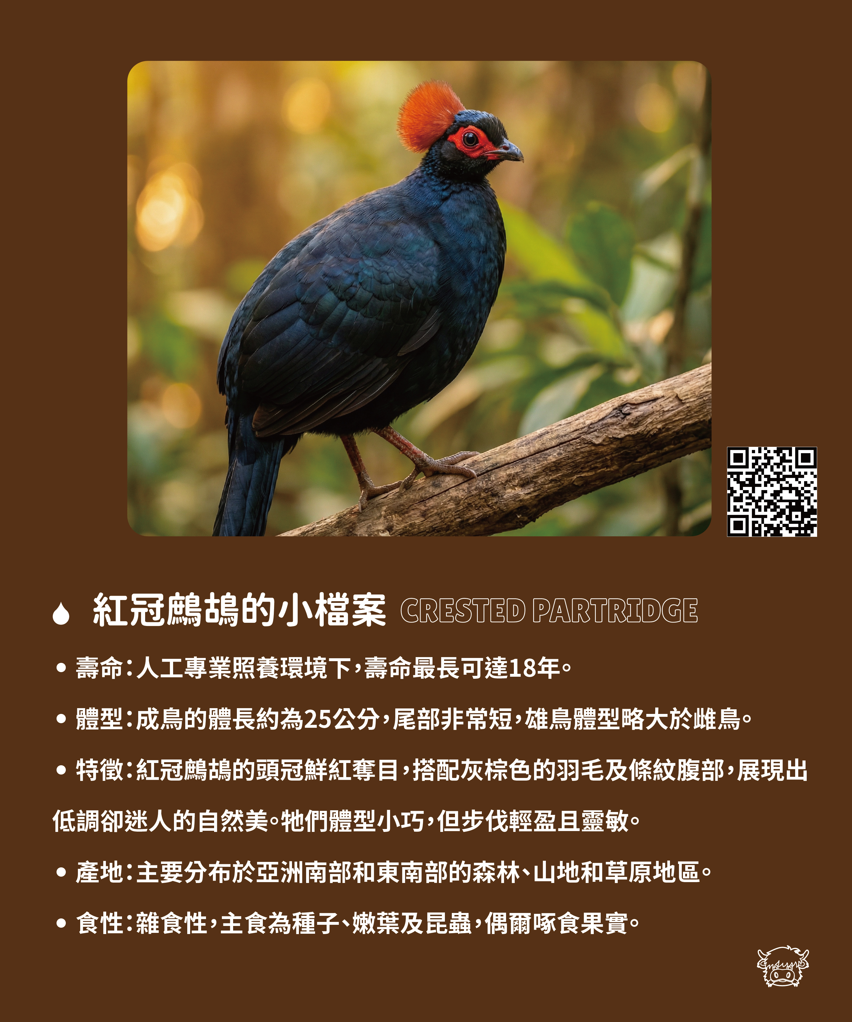 歡迎來到紅冠鷓鴣的樂園!這些小巧而優雅的鳥兒,以鮮紅的頭冠和細膩的羽毛圖案,為森林和草原增添了靈動的魅力。紅冠鷓鴣不僅是自然界的美麗成員,更是大地的歌者與平衡者。牠們沉靜的羽色藏著野性的警覺,在林間步履間,牠總是來無影、去無聲。