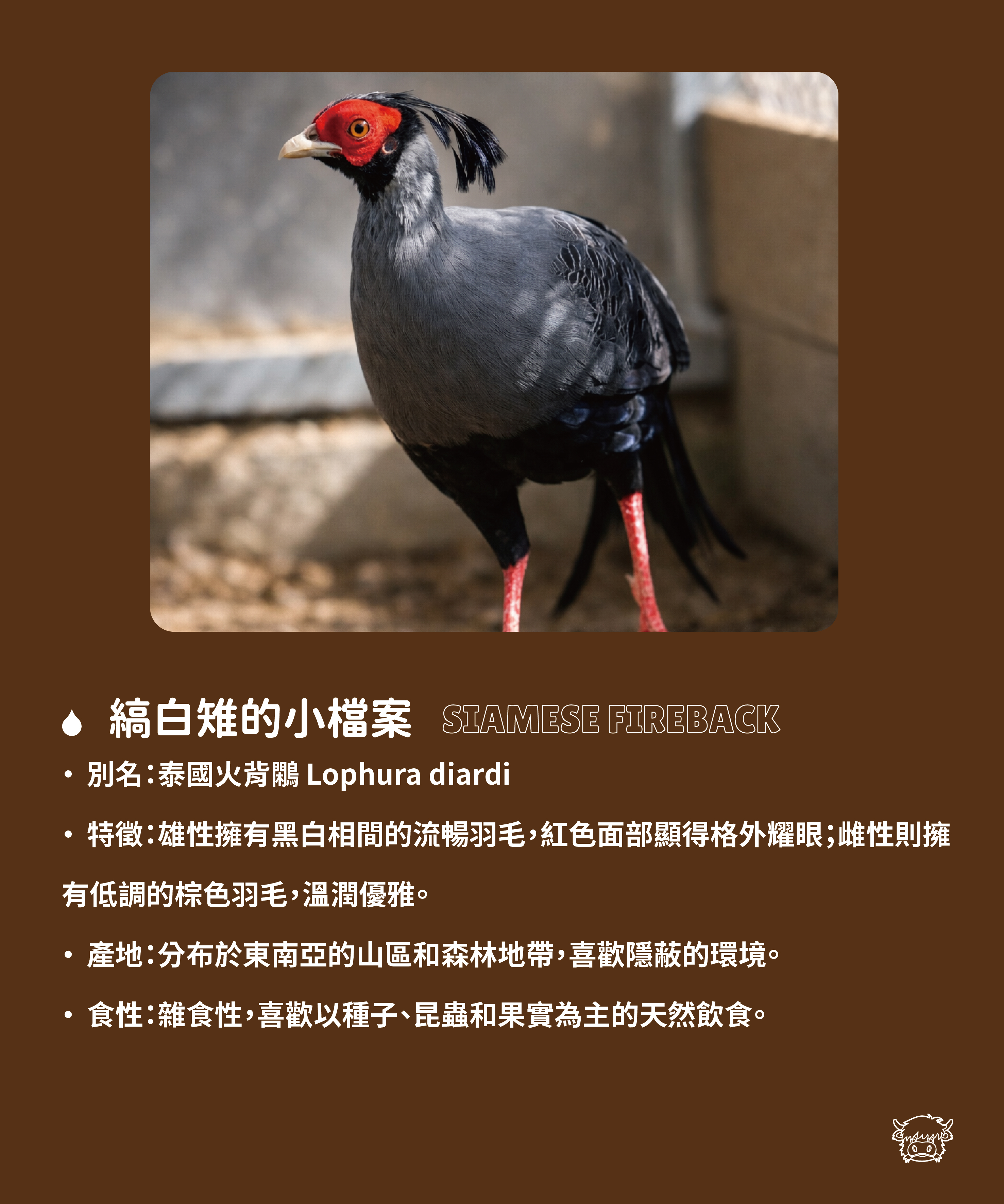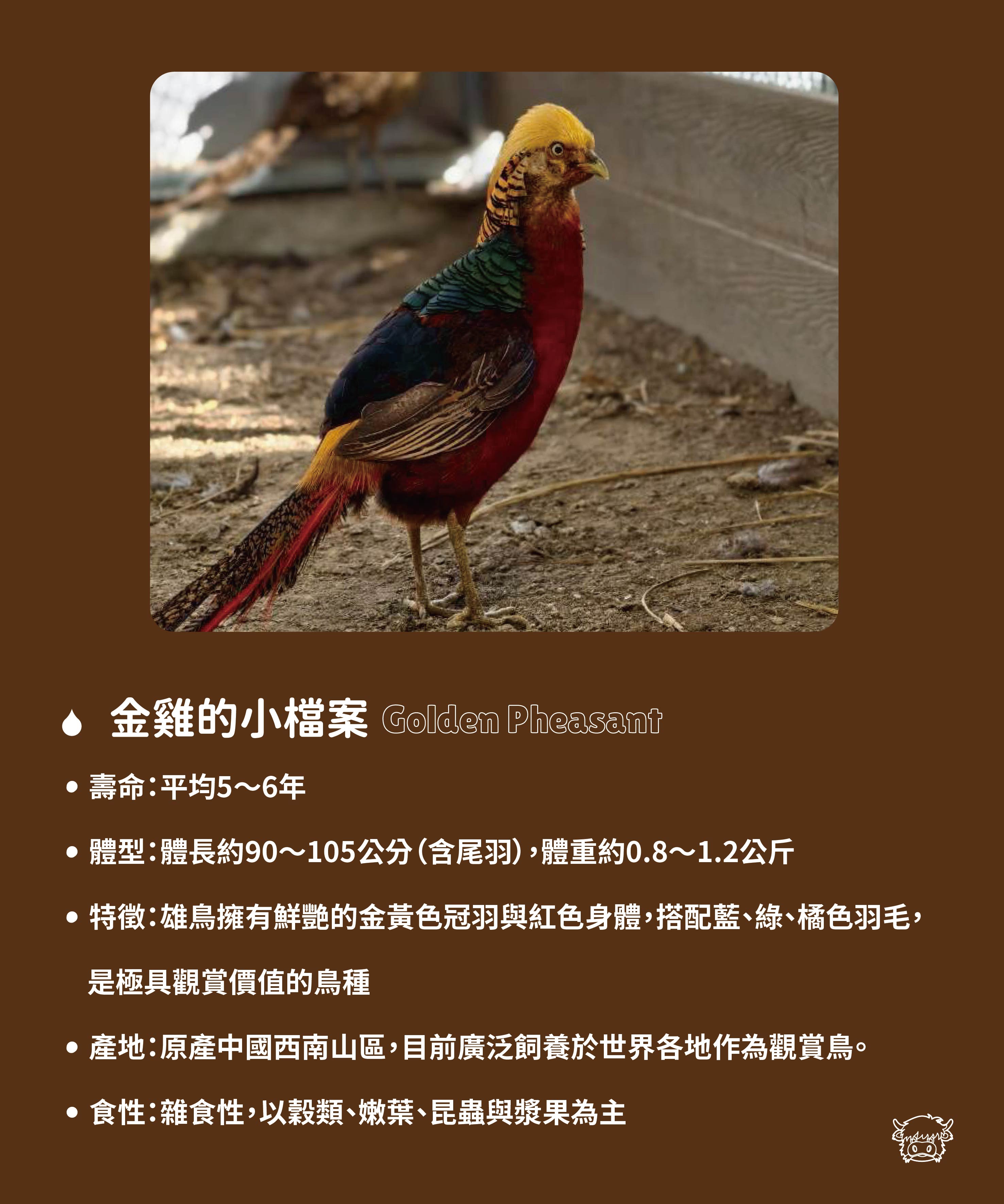 擁有金黃色羽冠與如火焰般的身體羽色,金雞被譽為「森林中最華麗的舞者」,每一個轉身都像一場自然界的時尚秀 ! 牠們不僅外型耀眼,溫馴警覺的個性,也讓金雞成為園區裡的觀賞焦點。