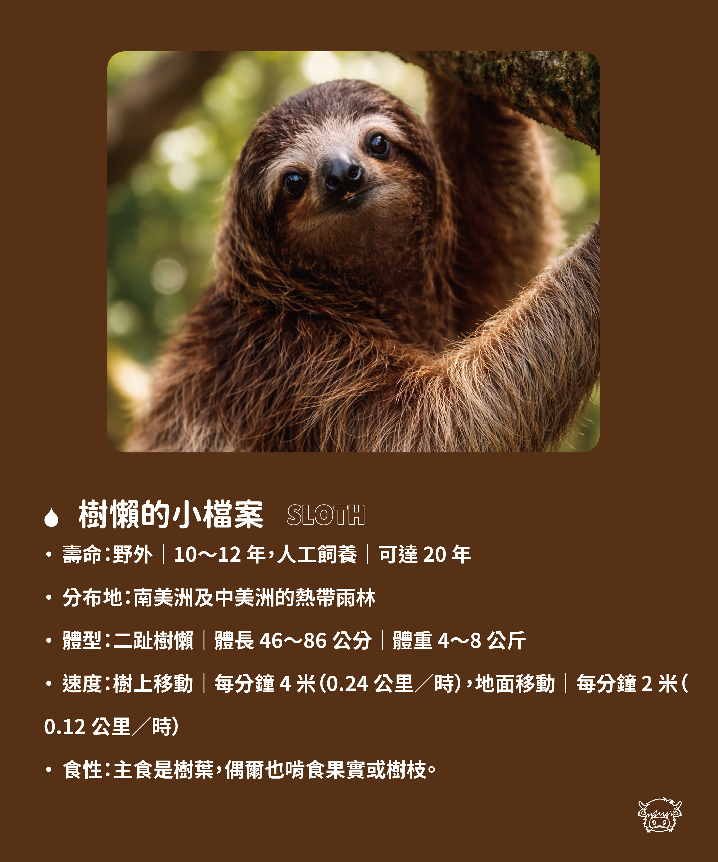 歡迎來到「慢活樂園」,與世界上最慢的動物——樹懶,進行一場慢時光的心靈對話!牠不急不徐,用一生告知訴我們:慢,是一種從容的選擇